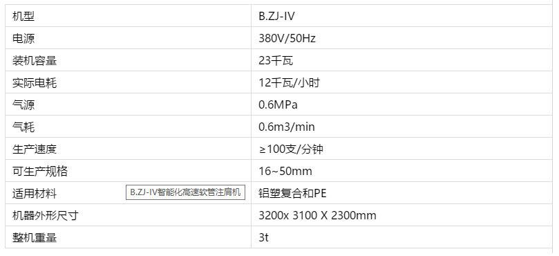 B.ZJ-IV智能化高速軟管注肩機由間隙分度定位機構(gòu)、上管系統(tǒng)、吐塑系統(tǒng)、成型系統(tǒng)、冷卻系統(tǒng)、出管系統(tǒng)、自動化系統(tǒng)控制等構(gòu)成的。其中上管系統(tǒng)涵蓋與上道制管的過渡連接分配機構(gòu)、上管機械手、普通上管式機構(gòu)或?qū)?biāo)定位上管式機構(gòu)構(gòu)成的。機器設(shè)備集機、電、氣及與物聯(lián)網(wǎng)通訊于一體化,實現(xiàn)完全智能化系統(tǒng)操控的高速軟管注肩機。優(yōu)勢:該設(shè)備具備速率快、肩部壁厚均勻、吐塑精度高(可操控在0.05克誤差范圍內(nèi))、產(chǎn)品肩